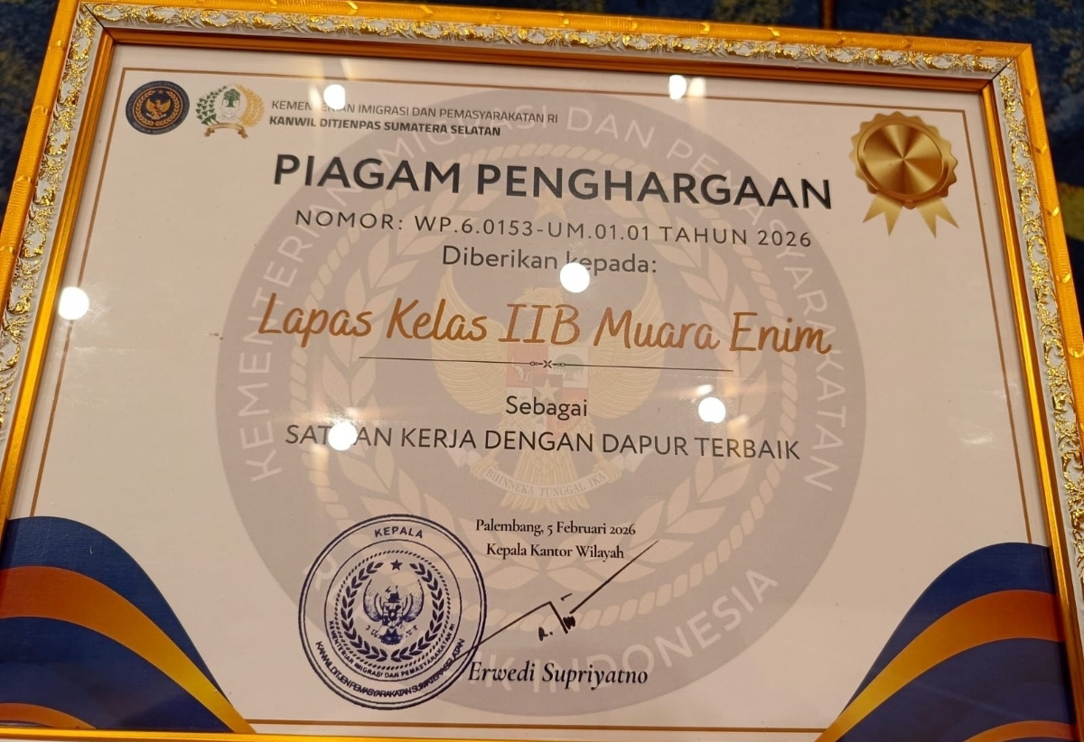Nusantara Aktual – Palembang – Lembaga Pemasyarakatan Kelas IIB Muara Enim kembali menorehkan prestasi membanggakan dengan meraih penghargaan sebagai Dapur Terbaik di lingkungan Pemasyarakatan. Penghargaan ini diberikan sebagai bentuk apresiasi atas komitmen dan konsistensi Lapas Muara Enim dalam menjaga kualitas penyelenggaraan makanan bagi warga binaan, baik dari sisi kebersihan, kelayakan gizi, maupun pengelolaan dapur yang tertib dan higienis. Kamis (05/02)